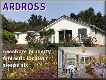 Large detached cottage, set in around one acre of grounds extending directly to the sea shore. Glorious views over the gardens and sea to the hills beyond. Sleeps 6 in 3 bedrooms.